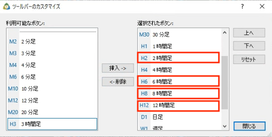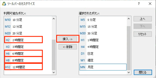 左側の「利用可能なボタン」の中から「2時間足」を選択していただき真ん中にある「挿入」のボタンを押していただくと右側の「選択されたボタン」に移動します。