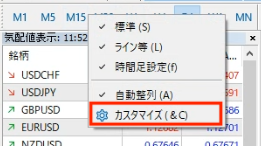 この時間足の上で右クリックをしていただくと以下のような表示がされますので「カスタマイズ」をクリックしてください。